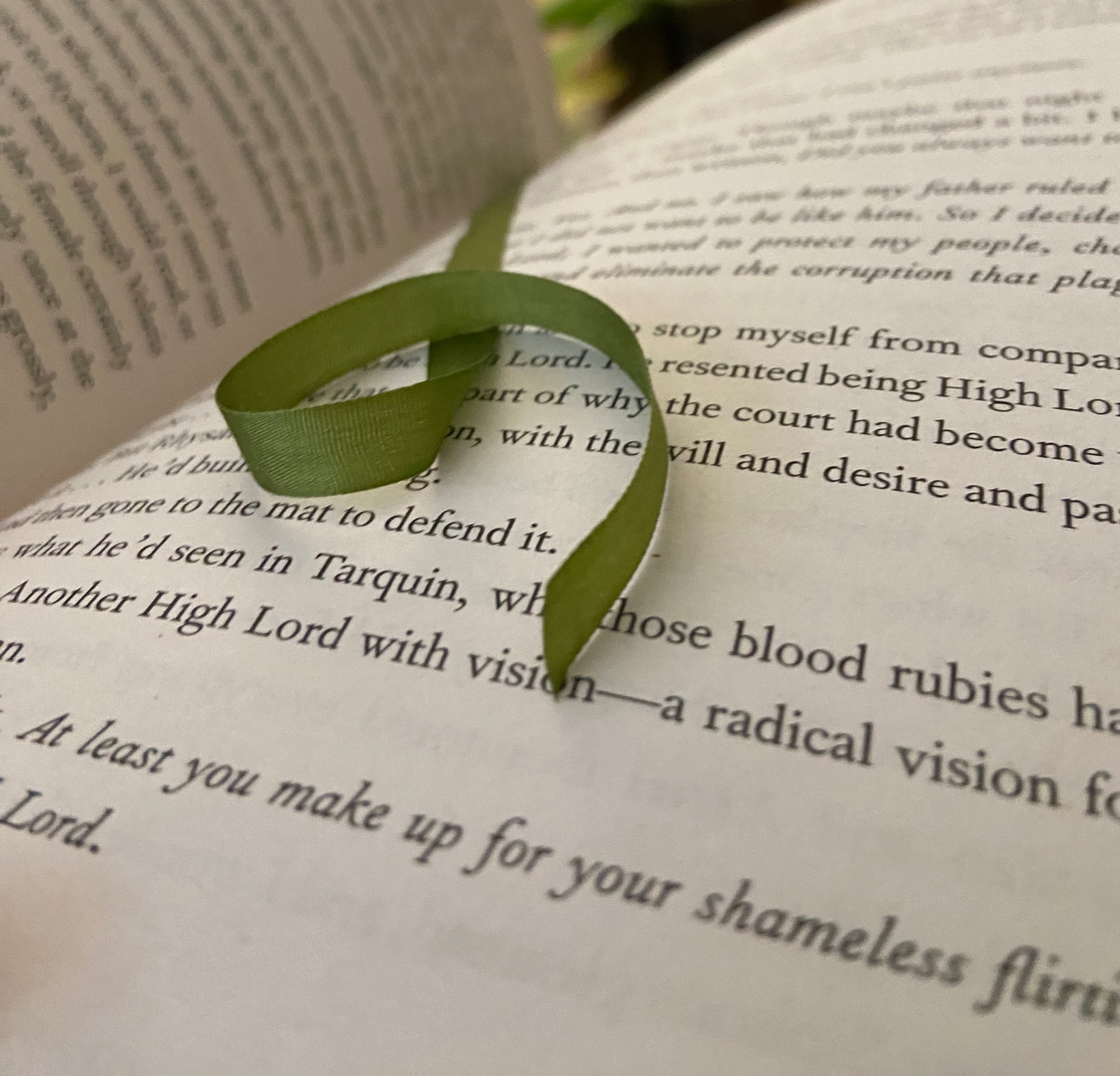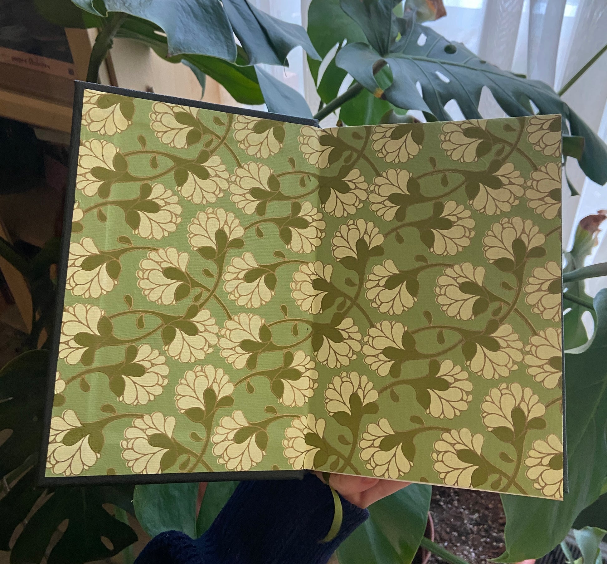 Endbands are handsewn with cotton embroidery thread, bookmarks are silk, and gilded edges are made using a metallic acrylic paint.
