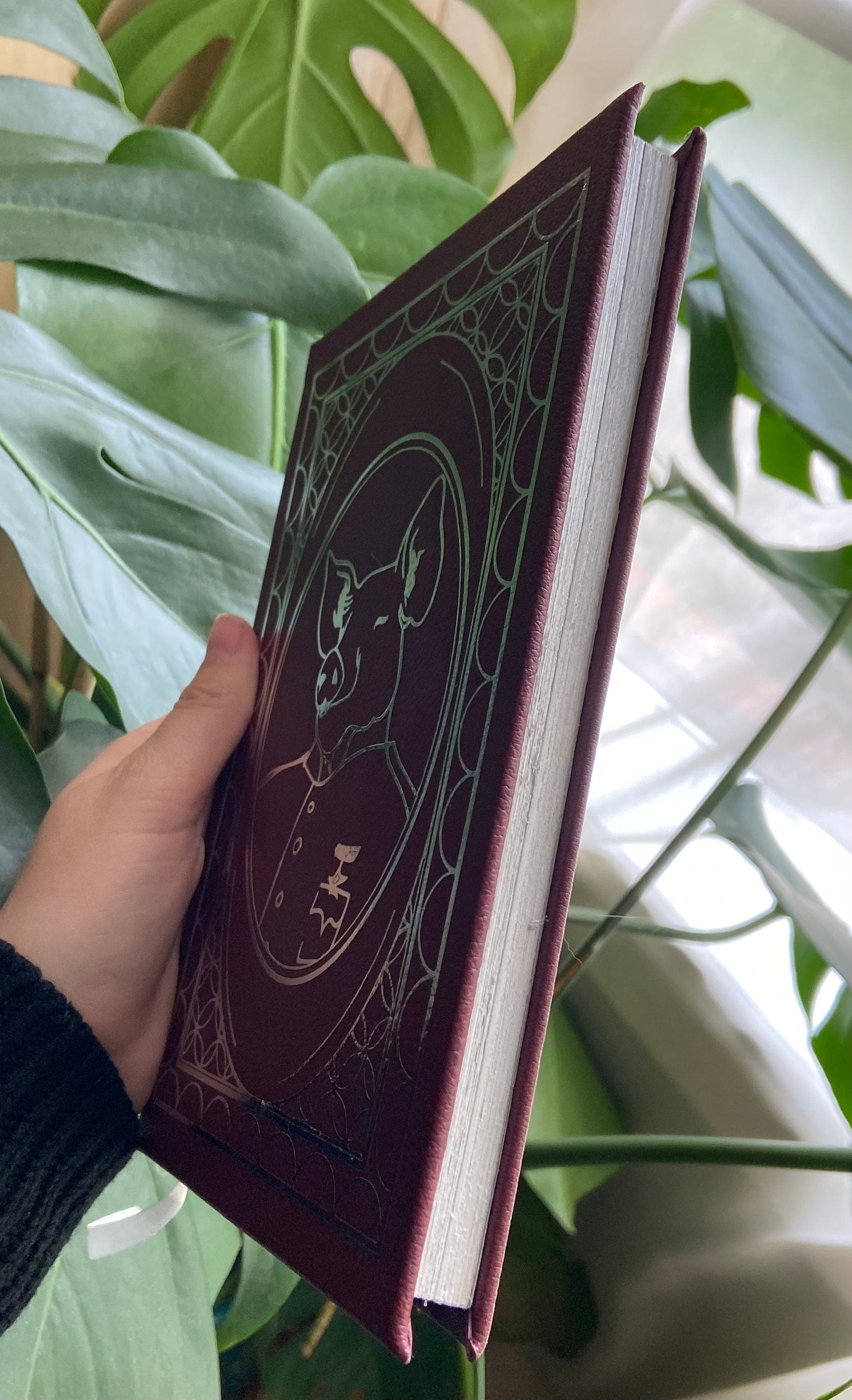 The cover is a deep burgundy red with a silver design of Napoleon in a Russian style military uniform, as if posing for a portrait. This edition is bound in vegetable tanned goat leather, with marbled endpapers and silver page edges. The spine is done in a classic style with title and author name, with custom endbands and silver silk bookmark ribbon. The back features animal species prints from the novel's key characters.