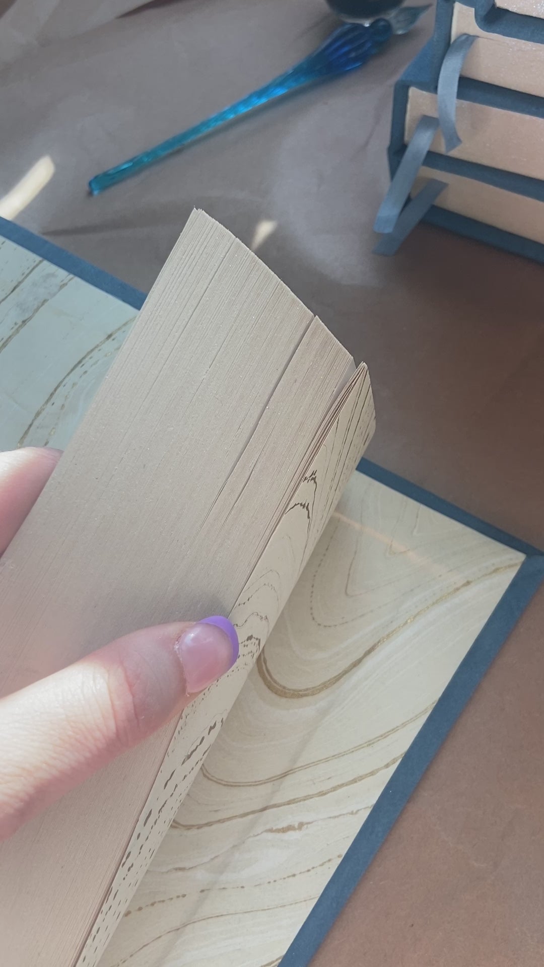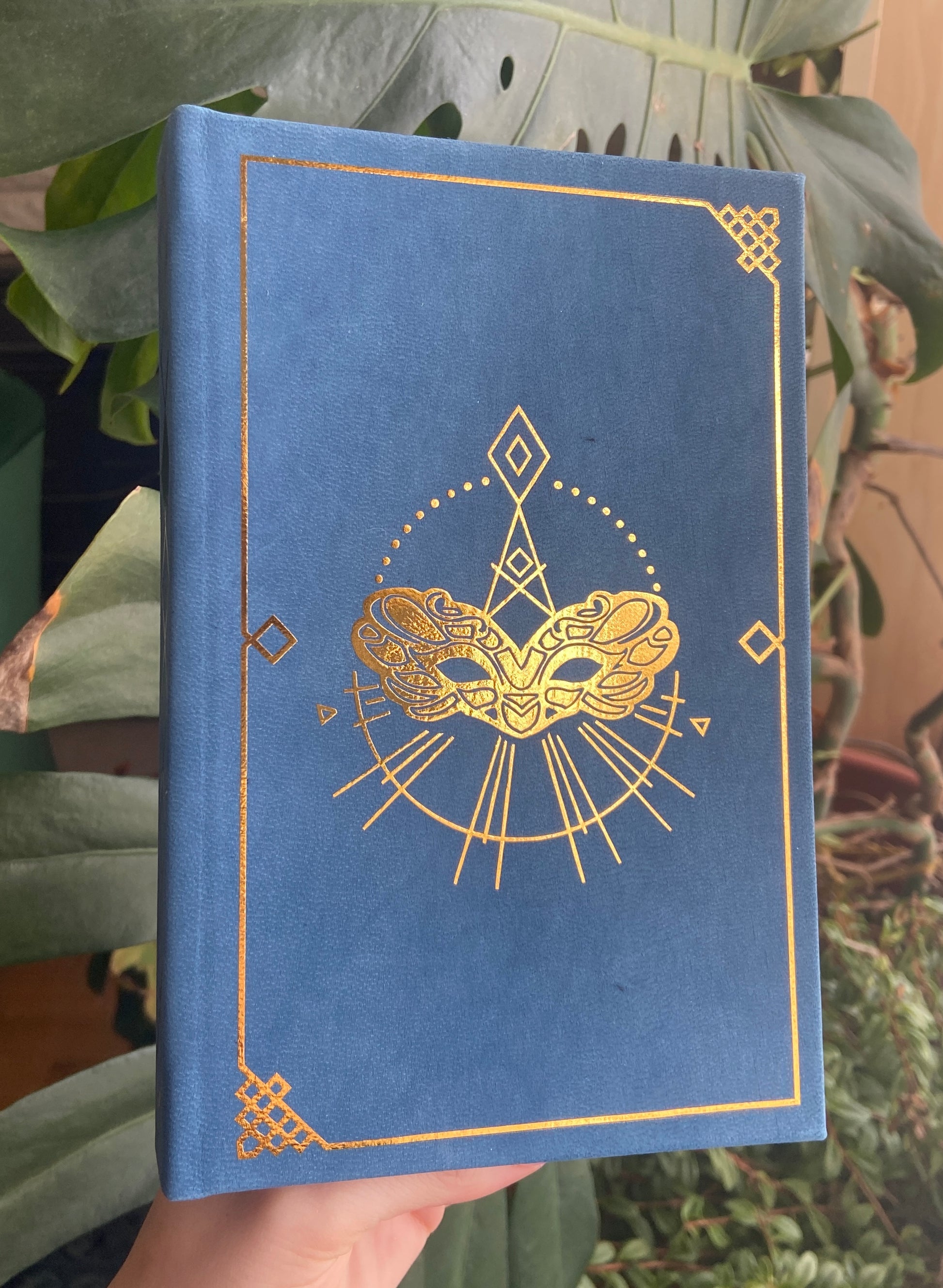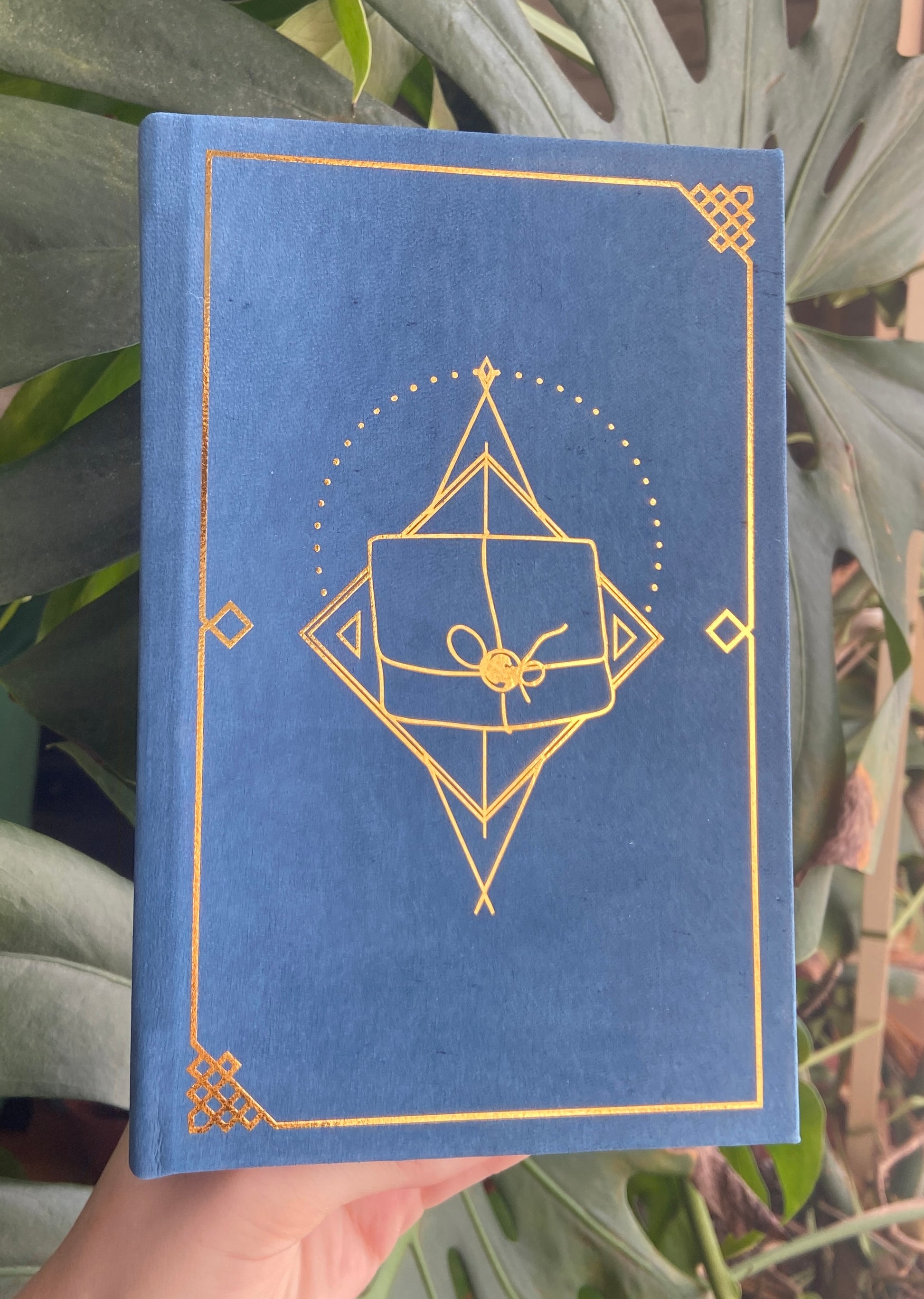 Each book is bound in blue vegetable tanned goat leather with a soft and smooth texture, with designs in gold. The spine features a diamond design, indicating which book in the series each is, with replicated author's signature on the back.