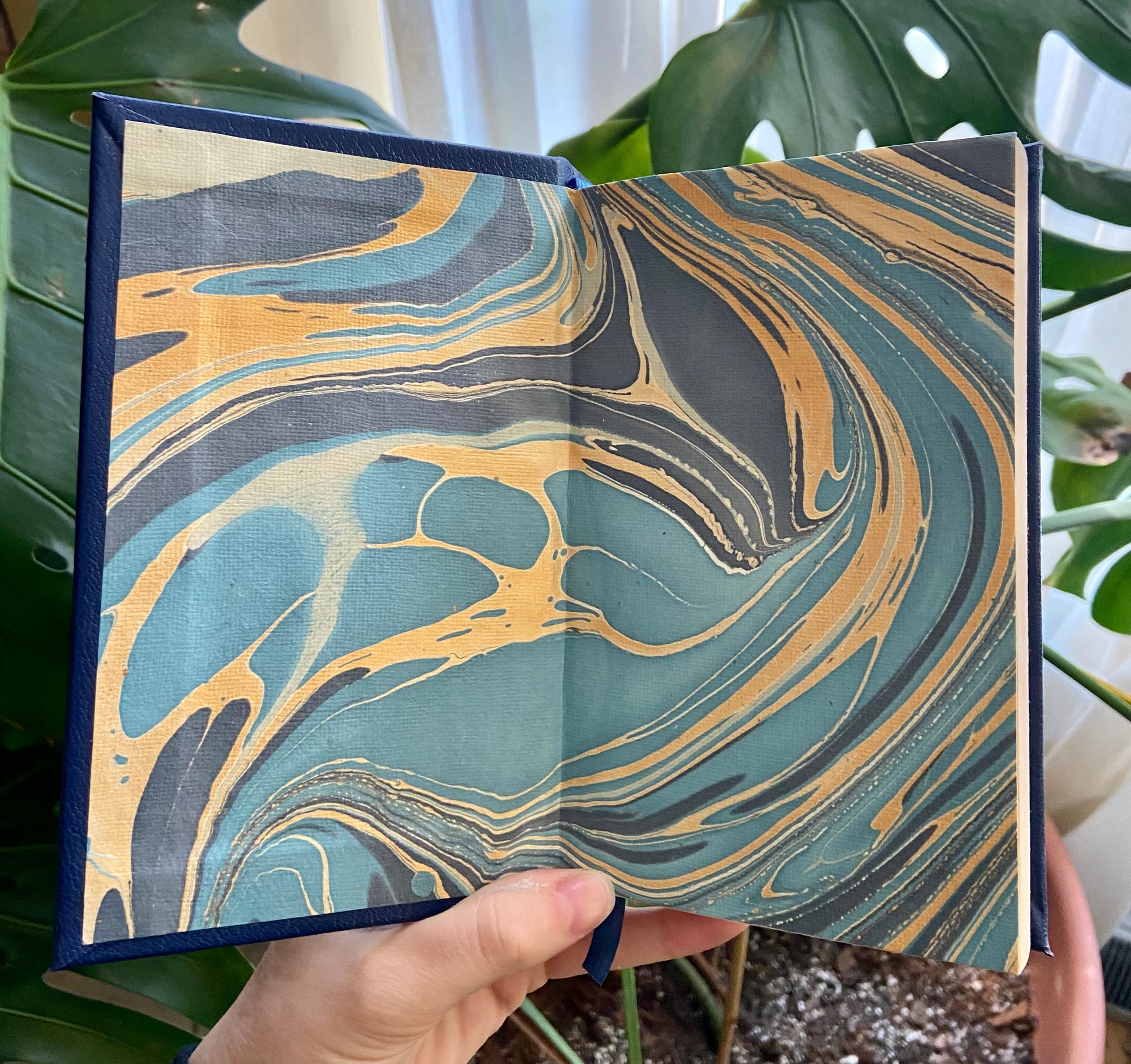 Endbands are handsewn with cotton embroidery thread, bookmarks are silk, and gilded edges are made using a metallic acrylic paint.