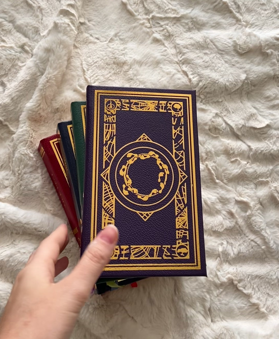 Each book has the color scheme - red, green, blue, and violet- to match with the protagonist's magic. These editions are bound in vegetable tanned goat leather, with marbled color coordinated endpapers and silk bookmarks. The spine is done in a classic style with title and author name.