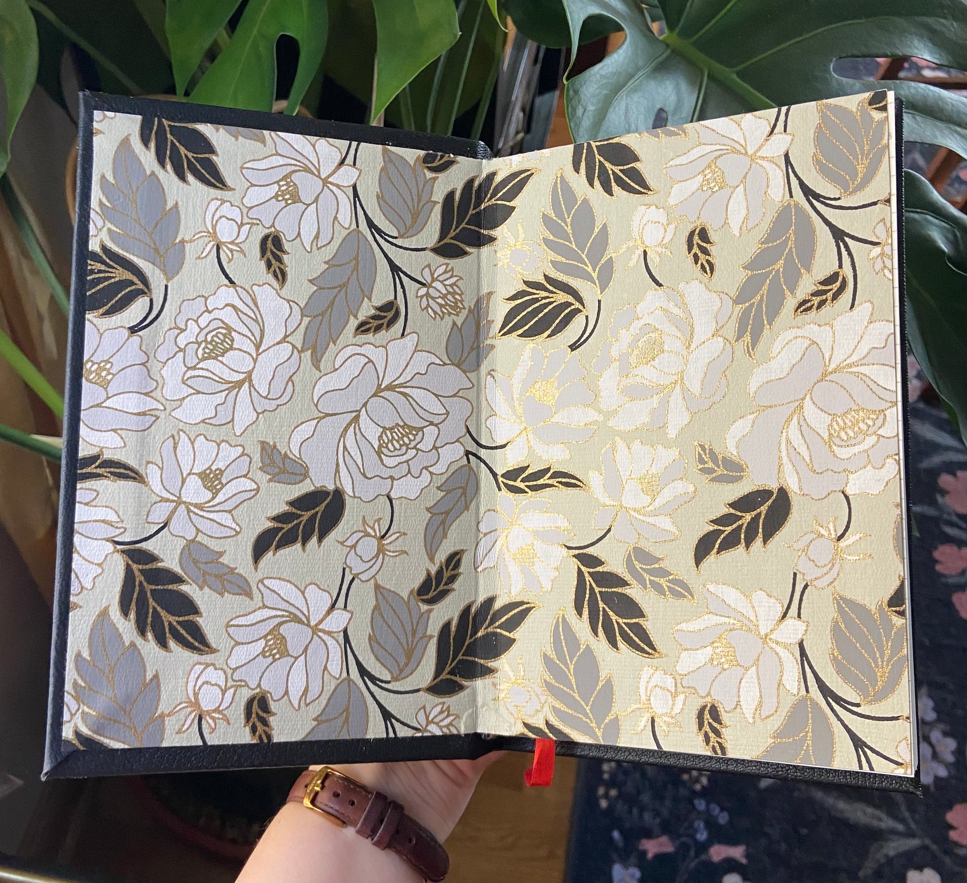 The cover is a elegant black leather with silver design. This edition is bound in vegetable tanned leather, with grayscale rose cotton rag endpapers. The spine is done in a classic style with title and author name and includes a red silk bookmark.