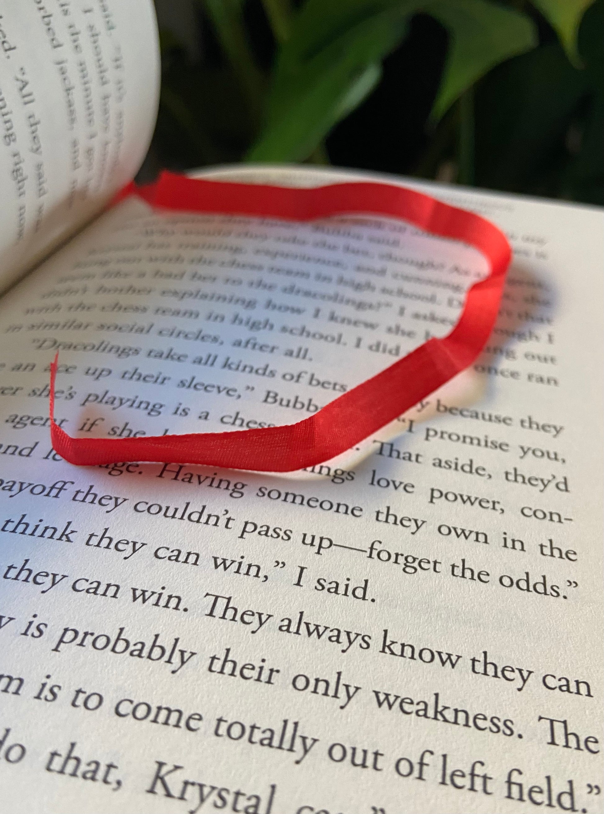Endbands are handsewn with cotton embroidery thread, bookmarks are silk, and gilded edges are made using a metallic acrylic paint.